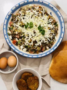 Fava beans garnished with fresh onions, tomatoes, chilli peppers, feta cheese or yoghurt and ghee/ olive oil served with bread