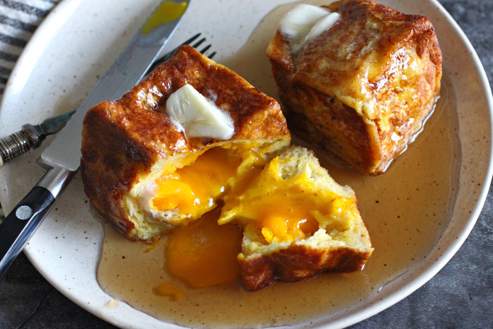 Sliced bread soaked inbetween eggs and milk/ cream cheese and cinamon