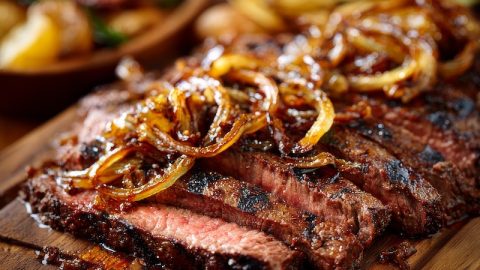 A sliced cut beef marinated and grilled served with rice or fries or mashed potatoes