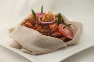 Dried spiced beef (quanta) with onions, garlic and aromatic spices served with torn pieces of injera